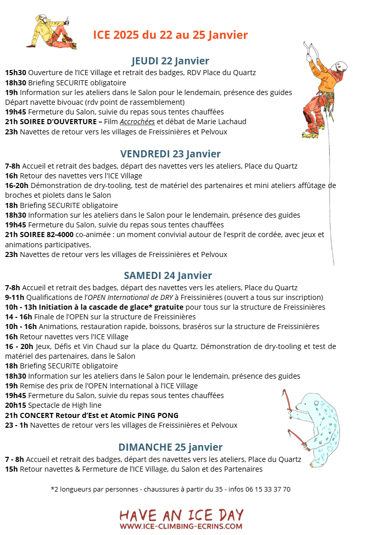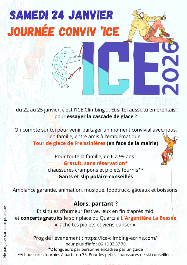 9h30 – Navette départ initiation pour la Conviv’ICE à Freissinières (parfait pour ceux qui veulent tester sans se transformer en glaçon humain), présence de l’association ’’Comme un poisson dans la neige" pour le ravito.